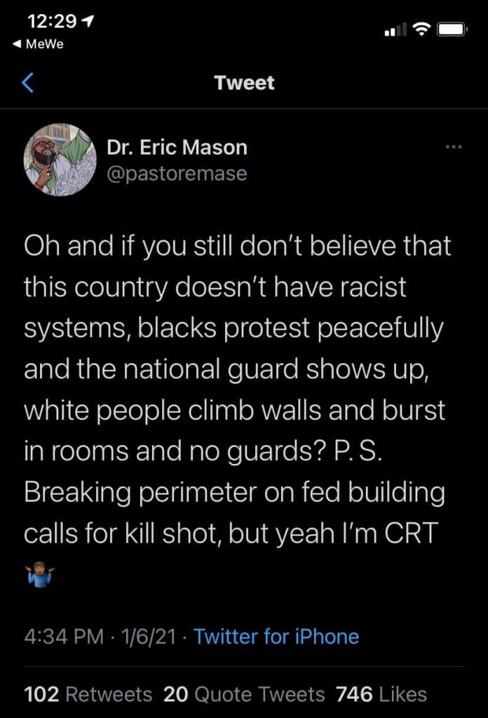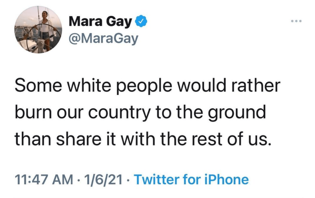 We’ve been told for years that labeling an entire group of people (especially identified by skin color) is wrong, yet the explosion in the last few months of the acceptability of blatantly racist posts and statements, so long as they come from those of the “oppressed group” (based on Critical Race Theory) have become commonplace. The image of the Mara Gay tweet was reposed by someone that I have long considered a brother and friend, who happens to be African-American. Someone who I though knew me better than to post or confirm something like this that is so brazenly racist.